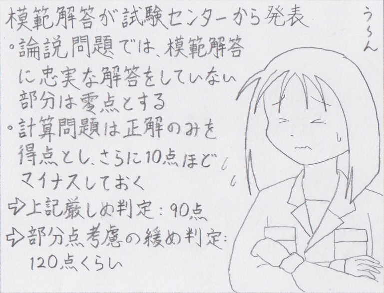 そうか。論説問題を選ぶと、自己採点がしづらいなぁ。でも大体どれくらい取れていそうだった? |