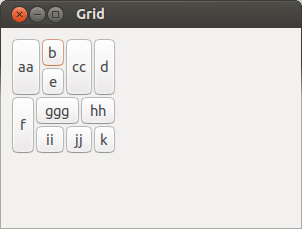 button1 = gtk_button_new_with_label("aa");gtk_grid_attach(GTK_GRID(grid), button1, 0, 0, 2, 2); button2 = gtk_button_new_with_label("b"); gtk_grid_attach(GTK_GRID(grid), button2, 2, 0, 1, 1); button3 = gtk_button_new_with_label("cc"); gtk_grid_attach(GTK_GRID(grid), button3, 3, 0, 2, 2); button4 = gtk_button_new_with_label("d"); gtk_grid_attach(GTK_GRID(grid), button4, 5, 0, 1, 2); button5 = gtk_button_new_with_label("e"); gtk_grid_attach(GTK_GRID(grid), button5, 2, 1, 1, 1); button6 = gtk_button_new_with_label("f"); gtk_grid_attach(GTK_GRID(grid), button6, 0, 2, 1, 2); button7 = gtk_button_new_with_label("ggg"); gtk_grid_attach(GTK_GRID(grid), button7, 1, 2, 3, 1); button8 = gtk_button_new_with_label("hh"); gtk_grid_attach(GTK_GRID(grid), button8, 4, 2, 2, 1); button9 = gtk_button_new_with_label("ii"); gtk_grid_attach(GTK_GRID(grid), button9, 1, 3, 2, 1); button10 = gtk_button_new_with_label("jj"); gtk_grid_attach(GTK_GRID(grid), button10, 3, 3, 2, 1); button11 = gtk_button_new_with_label("k"); gtk_grid_attach(GTK_GRID(grid), button11, 5, 3, 1, 1); gtk_widget_show_all(window); gtk_main(); return 0; } |