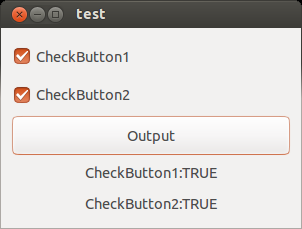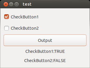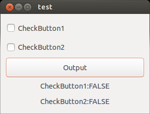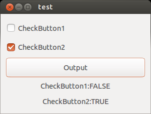 flag1 = gtk_toggle_button_get_active(GTK_TOGGLE_BUTTON(checkbutton1));flag2 = gtk_toggle_button_get_active(GTK_TOGGLE_BUTTON(checkbutton2)); if( flag1 == TRUE ){ gtk_label_set_text(GTK_LABEL(label1), "CheckButton1:TRUE"); } else{ gtk_label_set_text(GTK_LABEL(label1), "CheckButton1:FALSE"); } if( flag2 == TRUE ){ gtk_label_set_text(GTK_LABEL(label2), "CheckButton2:TRUE"); } else{ gtk_label_set_text(GTK_LABEL(label2), "CheckButton2:FALSE"); } } int main( int argc, char *argv[]) { GtkWidget *window; GtkWidget *vbox; GtkWidget *button; gtk_init(&argc, &argv); window = gtk_window_new(GTK_WINDOW_TOPLEVEL); gtk_widget_set_size_request(window, 300, 200); gtk_container_set_border_width(GTK_CONTAINER(window), 10); vbox = gtk_box_new(GTK_ORIENTATION_VERTICAL, 2); gtk_container_add(GTK_CONTAINER(window), vbox); checkbutton1 = gtk_check_button_new_with_label("CheckButton1"); gtk_box_pack_start(GTK_BOX(vbox), checkbutton1, TRUE, TRUE, 0); checkbutton2 = gtk_check_button_new_with_label("CheckButton2"); gtk_box_pack_start(GTK_BOX(vbox), checkbutton2, TRUE, TRUE, 0); button = gtk_button_new_with_label("Output"); gtk_box_pack_start(GTK_BOX(vbox), button, TRUE, TRUE, 0); label1 = gtk_label_new("CheckButton1:"); gtk_box_pack_start(GTK_BOX(vbox), label1, TRUE, TRUE, 0); label2 = gtk_label_new("CheckButton2:"); gtk_box_pack_start(GTK_BOX(vbox), label2, TRUE, TRUE, 0); g_signal_connect(G_OBJECT(button), "clicked", G_CALLBACK(cb_button_clicked), NULL); g_signal_connect(window, "destroy", G_CALLBACK(gtk_main_quit), NULL); gtk_widget_show_all(window); gtk_main(); return 0; } |