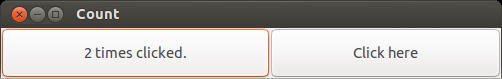 #include <gtk/gtk.h> static void cb_button(GtkWidget *widget, gpointer user_data) { static gint count = 0; gchar buf[64]; if( count < 1 ){ sprintf( buf, "%d time clicked.", ++count); } else { sprintf( buf, "%d times clicked.", ++count); } gtk_button_set_label(GTK_BUTTON(widget), buf); } int main(int argc, char** argv) { GtkWidget *window; GtkWidget *hbox; GtkWidget *button1; GtkWidget *button2; gtk_init(&argc, &argv); window = gtk_window_new(GTK_WINDOW_TOPLEVEL); gtk_window_set_title(GTK_WINDOW(window), "Count"); gtk_widget_set_size_request(window, 500, 50); g_signal_connect(G_OBJECT(window), "destroy", G_CALLBACK(gtk_main_quit), NULL); hbox = gtk_box_new(GTK_ORIENTATION_HORIZONTAL, 0); gtk_container_add(GTK_CONTAINER(window), hbox); button1 = gtk_button_new_with_label("0 time clicked."); gtk_box_pack_start(GTK_BOX(hbox), button1, TRUE, TRUE, 0); g_signal_connect(G_OBJECT(button1), "clicked", G_CALLBACK(cb_button), NULL); button2 = gtk_button_new_with_label("Click here"); gtk_box_pack_start(GTK_BOX(hbox), button2, TRUE, TRUE, 0); //button1クリック時と同じ関数を呼び出す