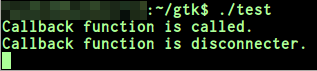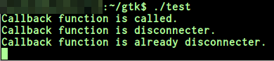 g_print( "Callback function is already disconnecter.\n" );} } int main(int argc, char** argv) { GtkWidget *window; GtkWidget *hbox; GtkWidget *button1; GtkWidget *button2; gulong handle; gtk_init(&argc, &argv); window = gtk_window_new(GTK_WINDOW_TOPLEVEL); gtk_window_set_title(GTK_WINDOW(window), "Disconnect"); gtk_widget_set_size_request(window, 500, 50); g_signal_connect(G_OBJECT(window), "destroy", G_CALLBACK(gtk_main_quit), NULL); hbox = gtk_box_new(GTK_ORIENTATION_HORIZONTAL, 0); gtk_container_add(GTK_CONTAINER(window), hbox); button1 = gtk_button_new_with_label("button1"); gtk_box_pack_start(GTK_BOX(hbox), button1, TRUE, TRUE, 0); //コールバック関数のIDを指定
