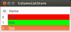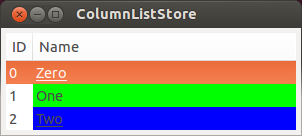 #include <gtk/gtk.h> enum { COLUMN_ID, COLUMN_NAME, COLUMN_NAME_COLOR, COLUMN_NAME_LINE, N_COLUMNS }; typedef struct _ListData { guint id; gchar *name; gchar *color; PangoUnderline linestyle; } ListData; static ListData data[] = { {0, "Zero", "Red", PANGO_UNDERLINE_SINGLE}, {1, "One", "Green", PANGO_UNDERLINE_NONE}, {2, "Two", "Blue", PANGO_UNDERLINE_SINGLE} }; static void add_data(GtkTreeView *treeview) { GtkListStore *store; GtkTreeIter iter; int i; store = GTK_LIST_STORE(gtk_tree_view_get_model(treeview)); for( i = 0; i < sizeof(data) / sizeof(data[0]); i++ ){ gtk_list_store_append(store, &iter); gtk_list_store_set(store, &iter, COLUMN_ID, data[i].id, COLUMN_NAME, data[i].name, COLUMN_NAME_COLOR, data[i].color, COLUMN_NAME_LINE, data[i].linestyle, -1); } } static GtkWidget* create_list_model(void) { GtkWidget *treeview; GtkListStore *liststore; GtkCellRenderer *renderer; GtkTreeViewColumn *column; //IDと名前の他に、列の背景色、アンダーラインのモデルを作成
