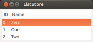 gtk_tree_view_append_column(GTK_TREE_VIEW(treeview), column);renderer = gtk_cell_renderer_text_new(); column = gtk_tree_view_column_new_with_attributes("Name", renderer, "text", COLUMN_NAME, NULL); gtk_tree_view_append_column(GTK_TREE_VIEW(treeview), column); return treeview; } int main(int argc, char** argv) { GtkWidget *window; GtkWidget *treeview; gtk_init(&argc, &argv); window = gtk_window_new(GTK_WINDOW_TOPLEVEL); gtk_window_set_title(GTK_WINDOW(window), "ListStore"); gtk_container_set_border_width(GTK_CONTAINER(window), 5); g_signal_connect(G_OBJECT(window), "destroy", G_CALLBACK(gtk_main_quit), NULL); gtk_widget_set_size_request(window, 300, 100); treeview = create_list_model(); gtk_container_add(GTK_CONTAINER(window), treeview); add_data(GTK_TREE_VIEW(treeview)); gtk_widget_show_all(window); gtk_main(); return 0; } |