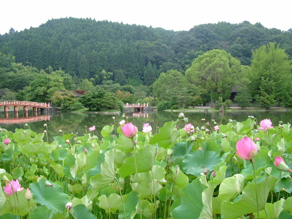 寺院中央の大道(だいどう)を進むと、北方に大きな池が広がり、白や桃色の蓮(はす)の花が、色鮮(あざ)やかに咲き誇って居る。その光景は宛(さなが)ら、浄土が現世に現れたかの如くである。