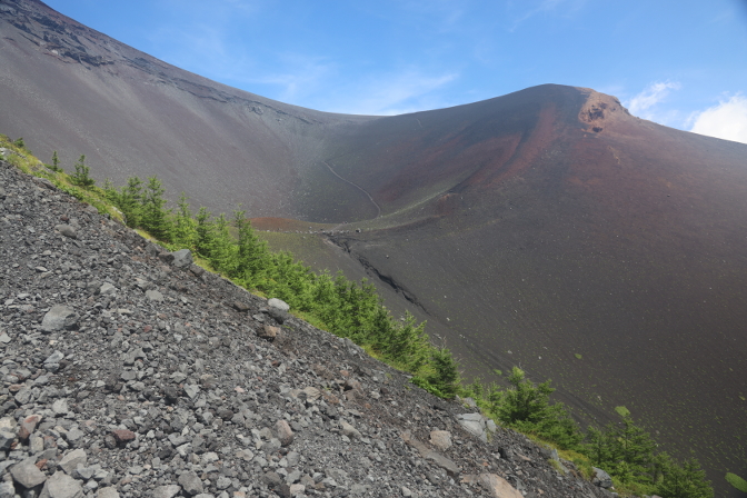 やがて、右手に第一火口と宝永山が姿を表した。先月御殿場口を往復しているが、宝永山を間近で見るのは、これが初めてである。