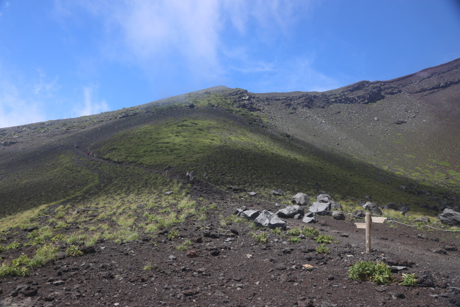 近道が見つからぬまま、やがて馬の背へ到着。第一火口縁を出発して、ちょうど1時間が経っていた。標識が有り、御殿場口七合目方面がよく見えた。山頂もバッチリ。これだけ視界が聞いていたら、先月の御殿場ルートで絶対に立ち寄っていた事を確認する。宝永山は反対側、すぐ先に見える。