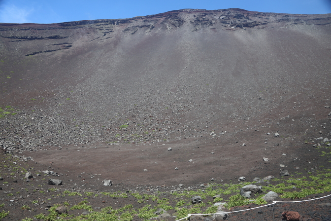 ここはブルドーザー道が無いので、自力で登り返せなくなったら、即遭難だなと考える。そして、第一火口の底から山頂方面を見上げる。