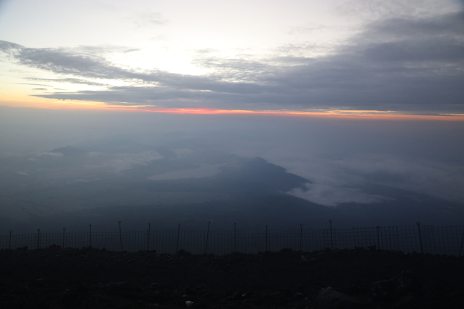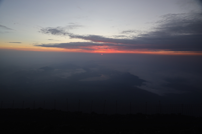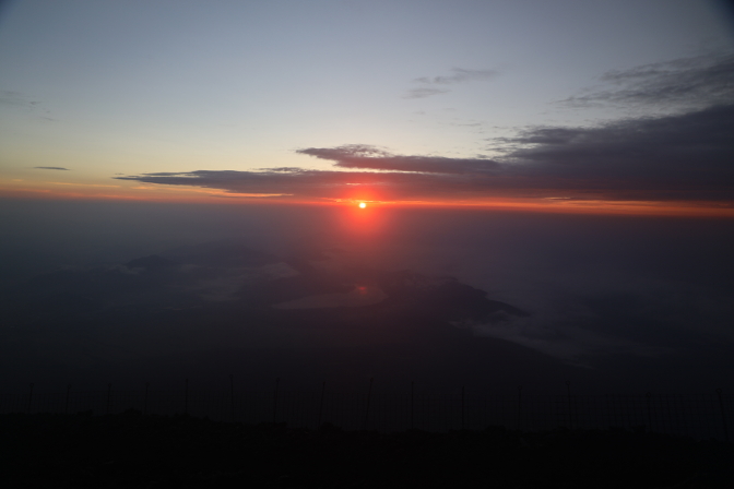 昨年は山頂到着直後の御来光で経験しなかったが、御来光をじっと待っているのは、かなり寒い。フリースをもう一枚羽織ろうかと考えたが、陽が昇れば暖かくなるはずなので、あと20分ほどを我慢する事にした。