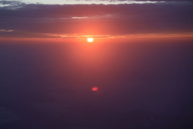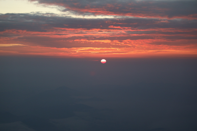 これが、今回の御来光です。青空が無いため、赤と灰色の世界。