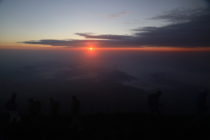 昨年は須走口より登り、吉田口と合流して、御来光館から渋滞し、日の出直前に山頂に着いた。今回もツアーの方で行列ができていたが、みなさん速い。思えば、昨日は標高1,850mを登り、その疲れが残っているようであった。富士宮口五合目の標高は、昨日雷鳴を聞き始めた辺りである。