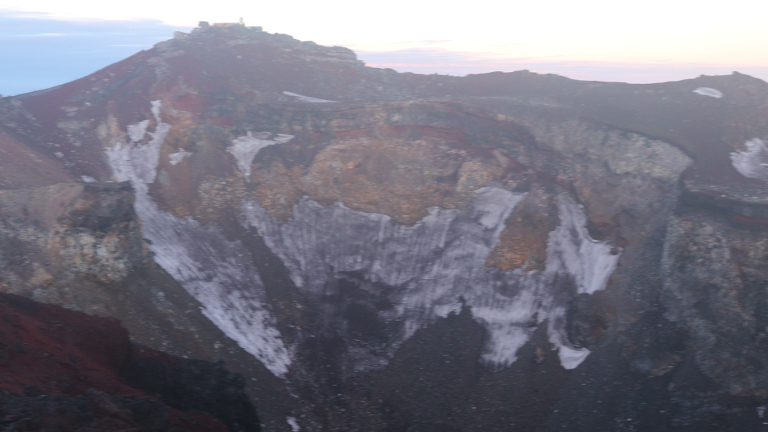後ろを振り返れば、お鉢の中央。遠くに剣ヶ峰が見える。この後、吉田口山頂に到着。久須志神社で御朱印と焼印をお願いするが、すごい行列。陽が昇れば、やはり温かい。
