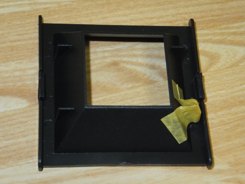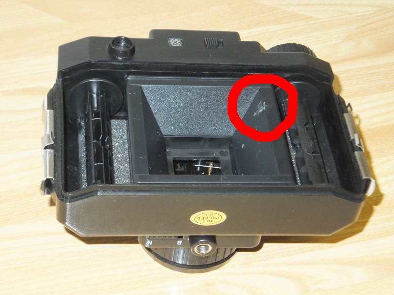 裏に赤窓があるが、感光をできる限り防ぐため、ここもパーマセルテープを貼る。巻き終えの確認の時だけはがす。このカメラ(治具)に120判フィルムを装填し、最初にたるまないように少し巻き取ると、裏紙に刃が刺さり、横方向に切れていく。あとはフタをして巻き取り終えれば、127判(幅46mmくらい)と残り(幅14mmくらい)にフィルムを切り取る事ができる。