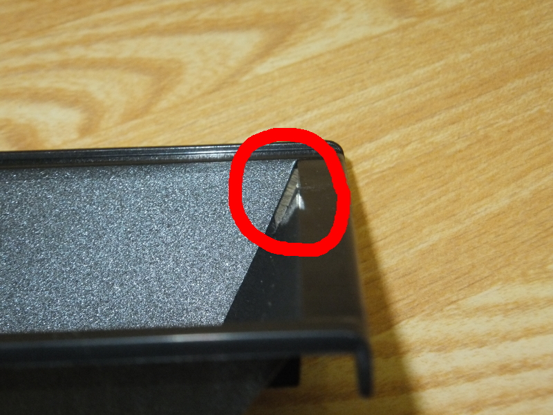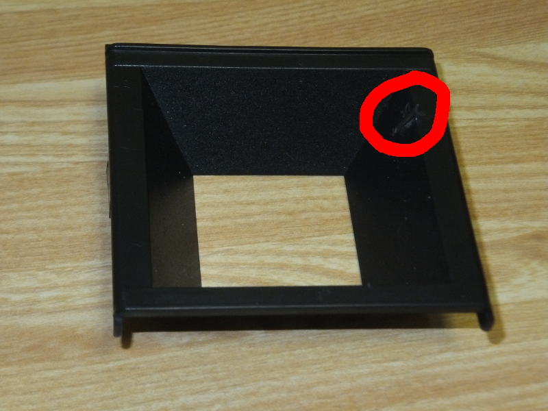 このナイフを使って、上図の所をグリグリ削り、穴を開ける。裏側に、固定するのにちょうどいい場所があるので、そこから穴を空ける。刃が程よい摩擦で貫通するようになったら、表側のバリも削っておく。バリ取りでバリを作らないように慎重に。